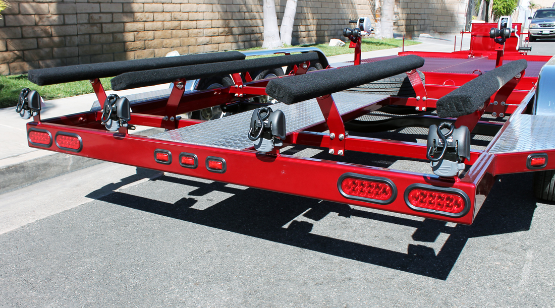 Additional cost options include, three custom racks up front, square front deck, loading ramps, spare tire, polished stainless steel fenders, polished aluminum walkway, extra rear oval lights, and stainless steel retractable tie downs. Shown in Candy Red - Hot, Hot Hot!